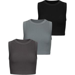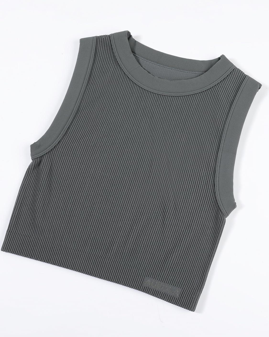 AUROLA Essentials Rib Seamless Sleeveless Tank for Women Subtle Logo Round Neck Active Workout Crop Tops(Pack (Black+steel Grey+bracken Brown))