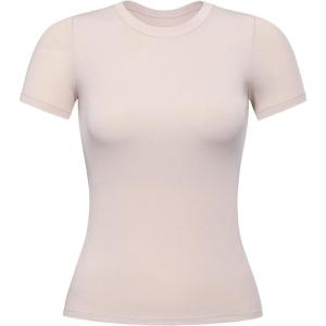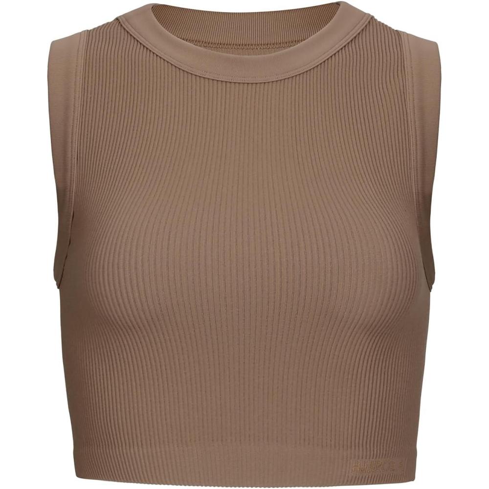 AUROLA Essentials Rib Seamless Sleeveless Tank for Women Subtle Logo Round Neck Active Workout Crop Tops(Lion Brown)
