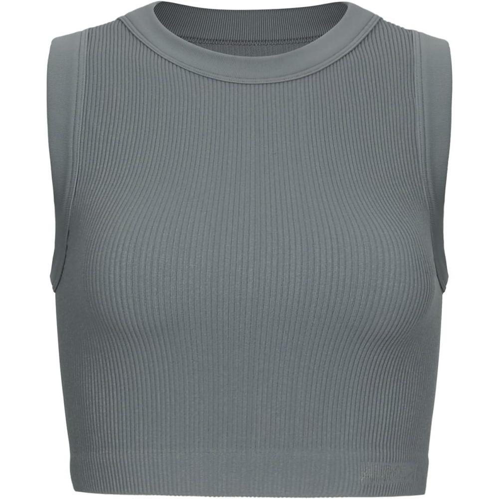 AUROLA Essentials Rib Seamless Sleeveless Tank for Women Subtle Logo Round Neck Active Workout Crop Tops(Steel Grey)