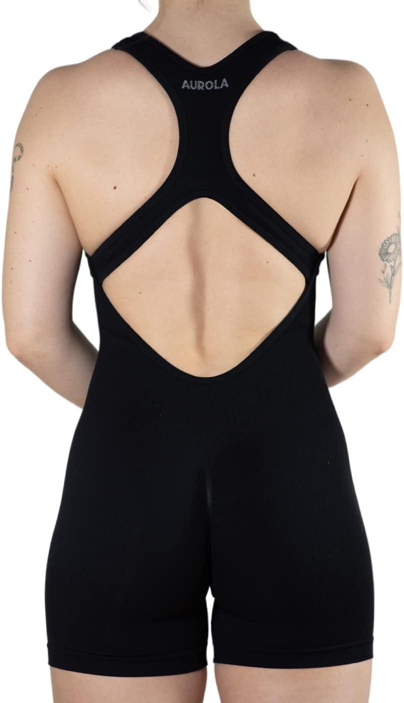 AUROLA Power Romper for Women Workout Yoga Gym Seamless One Piece Racerback Jumpsuit Tummy Control Padded Sports Bra(Black)