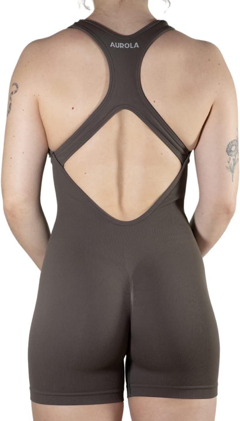 AUROLA Power Romper for Women Workout Yoga Gym Seamless One Piece Racerback Jumpsuit Tummy Control Padded Sports Bra(Chestnut Brown)