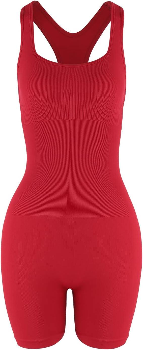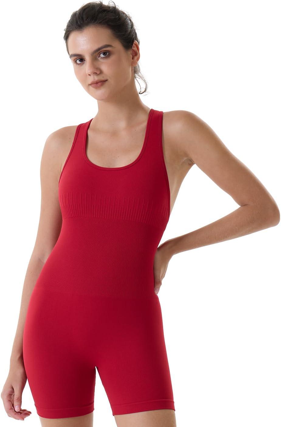 AUROLA Power Romper for Women Workout Yoga Gym Seamless One Piece Racerback Jumpsuit Tummy Control Padded Sports Bra(Chili Red)