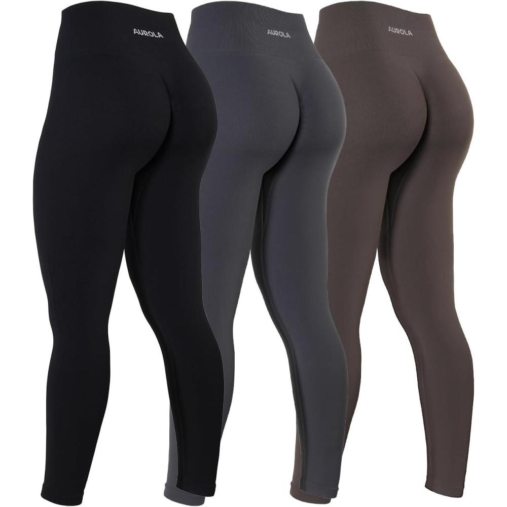 AUROLA Power Workout Leggings for Women Tummy Control Squat Proof Ribbed Thick Seamless Scrunch Active Pants(Pack (Black/Dark Grey/Chestnut Brown))